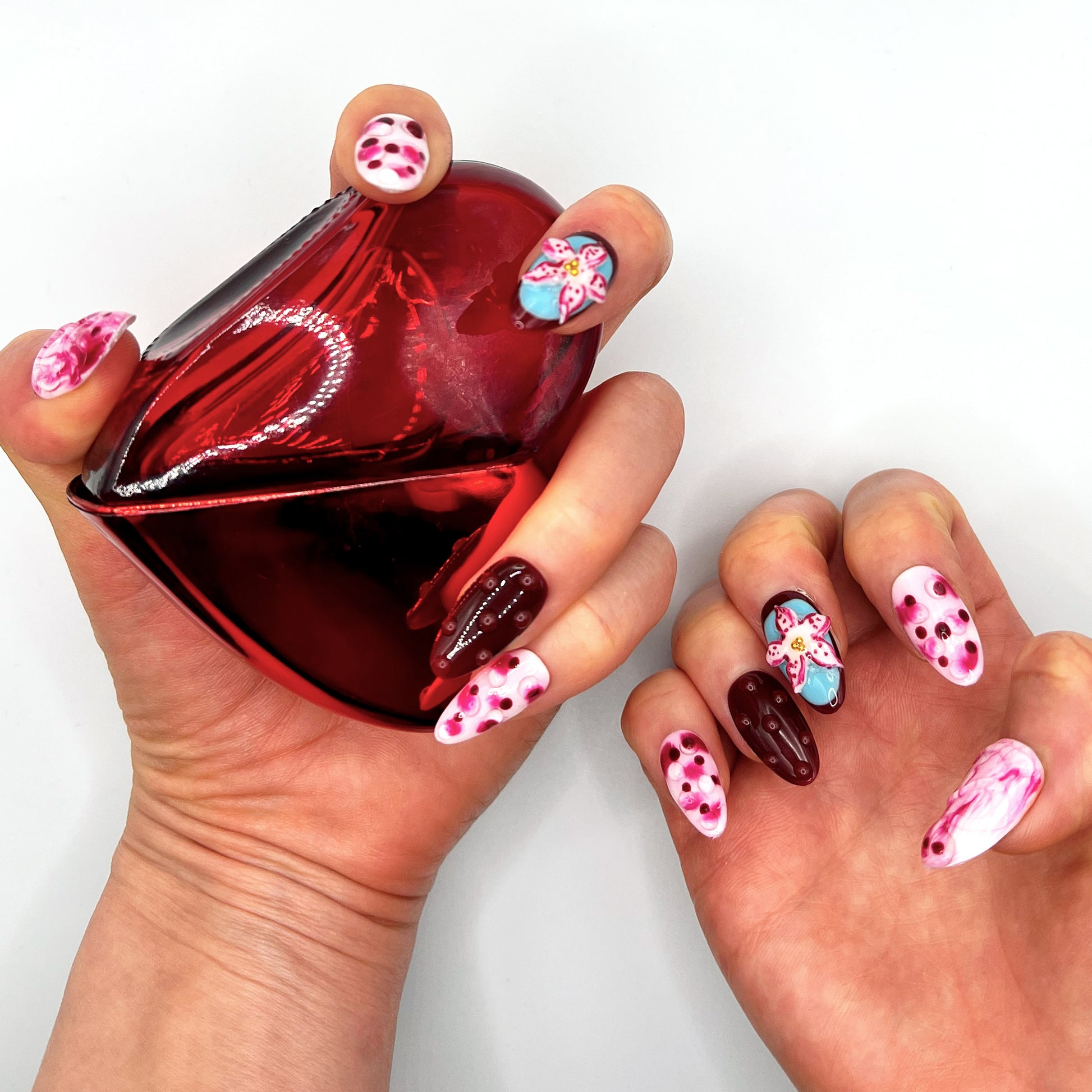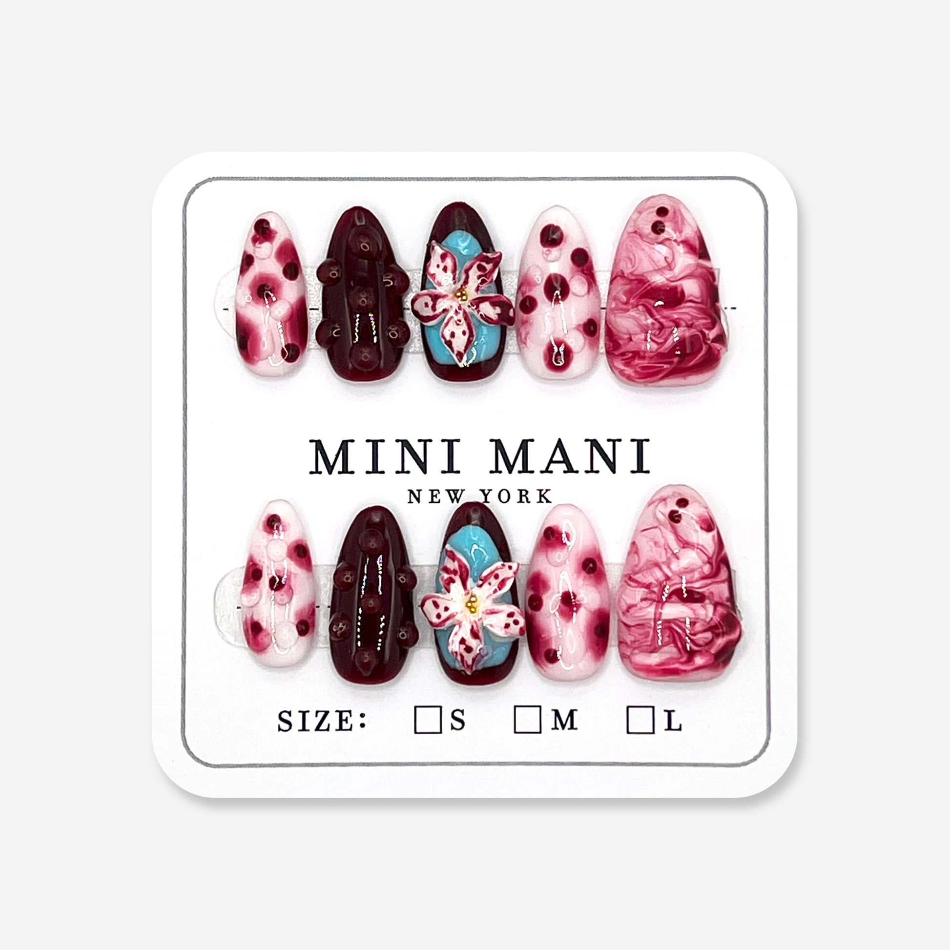 Product Description: Daring, artistic, and undeniably chic—Floral Reverie is a handmade press-on nail set that turns every hand gesture into a statement. With a striking mix of light blue and deep maroon-red, this set plays with contrast and texture to create a look that’s bold yet dreamy.