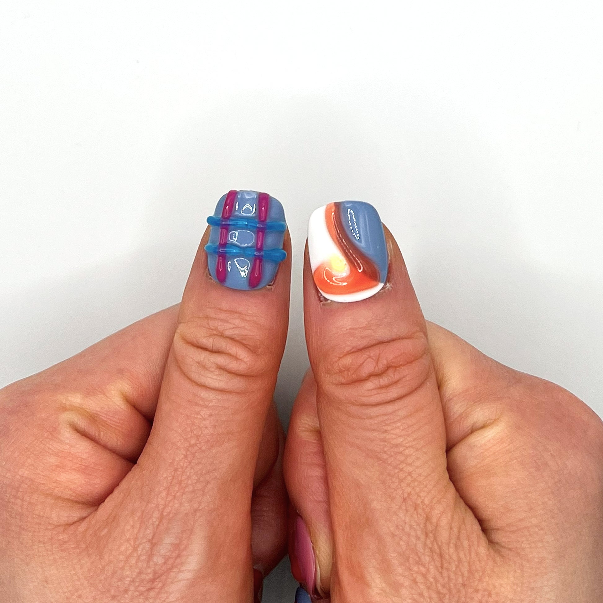 Each nail showcases a unique blend of colorful drizzle effects, check marks, and funky geometric shapes, creating a fun, tech-meets-pop-art vibe. It’s the perfect statement set for anyone who loves mixing color with creativity.