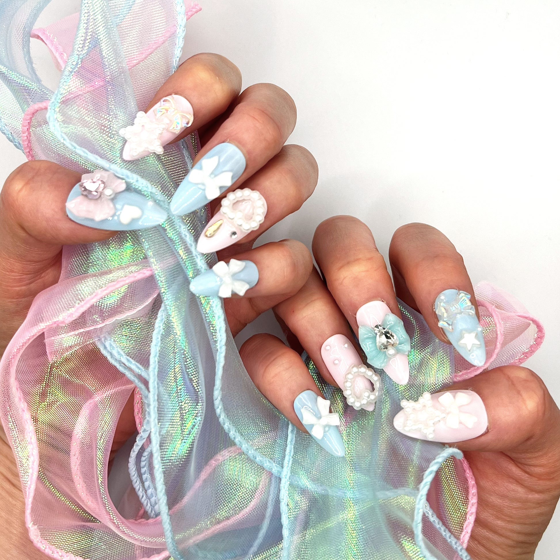 Product Description: Step into a dreamy wonderland with Bow Fantasy, a handmade press-on nail set that’s as sweet and whimsical as cotton candy. Featuring a soft pastel palette of pink and blue, this design is all about playful charm and delicate details. Tiny pearl hearts and stars bring a touch of fairytale sparkle, while multi-sized bow charms add the perfect dose of girly glam.